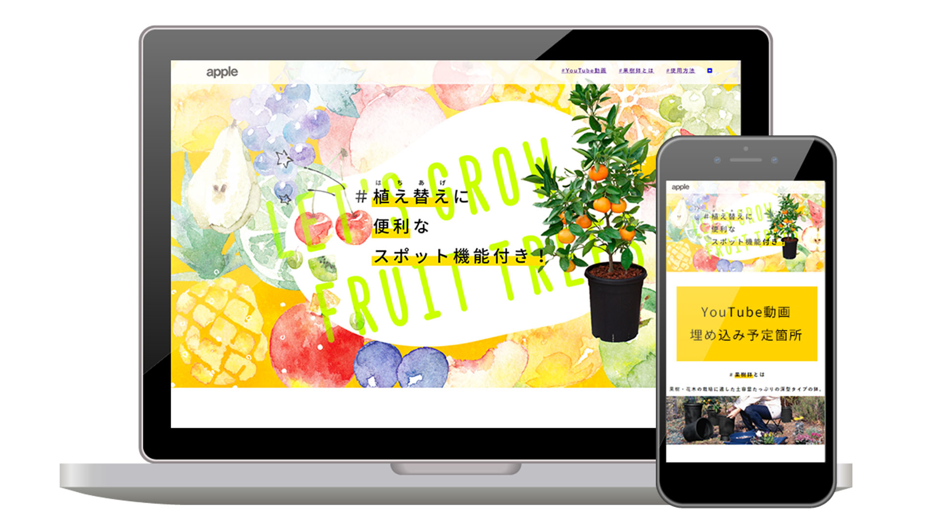 LP design WEB 2022.05.232023.05.07 アップルウェアー株式会社:果樹鉢LP制作 使用ツール AdobePhotoshopAdobeIllustratorVSCodeCyberduck 担当箇所 画像処理デザイン・レイアウトコーディング