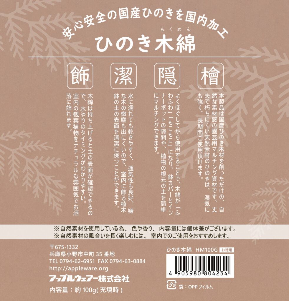 Package design PORTFOLIO 2021.11.252023.05.07 アップルウェアー株式会社:ひのき木綿HM100Gパッケージデザイン 表面 裏面 使用ツール AdobePhotoshopAdobeIllustrator ヘッダー